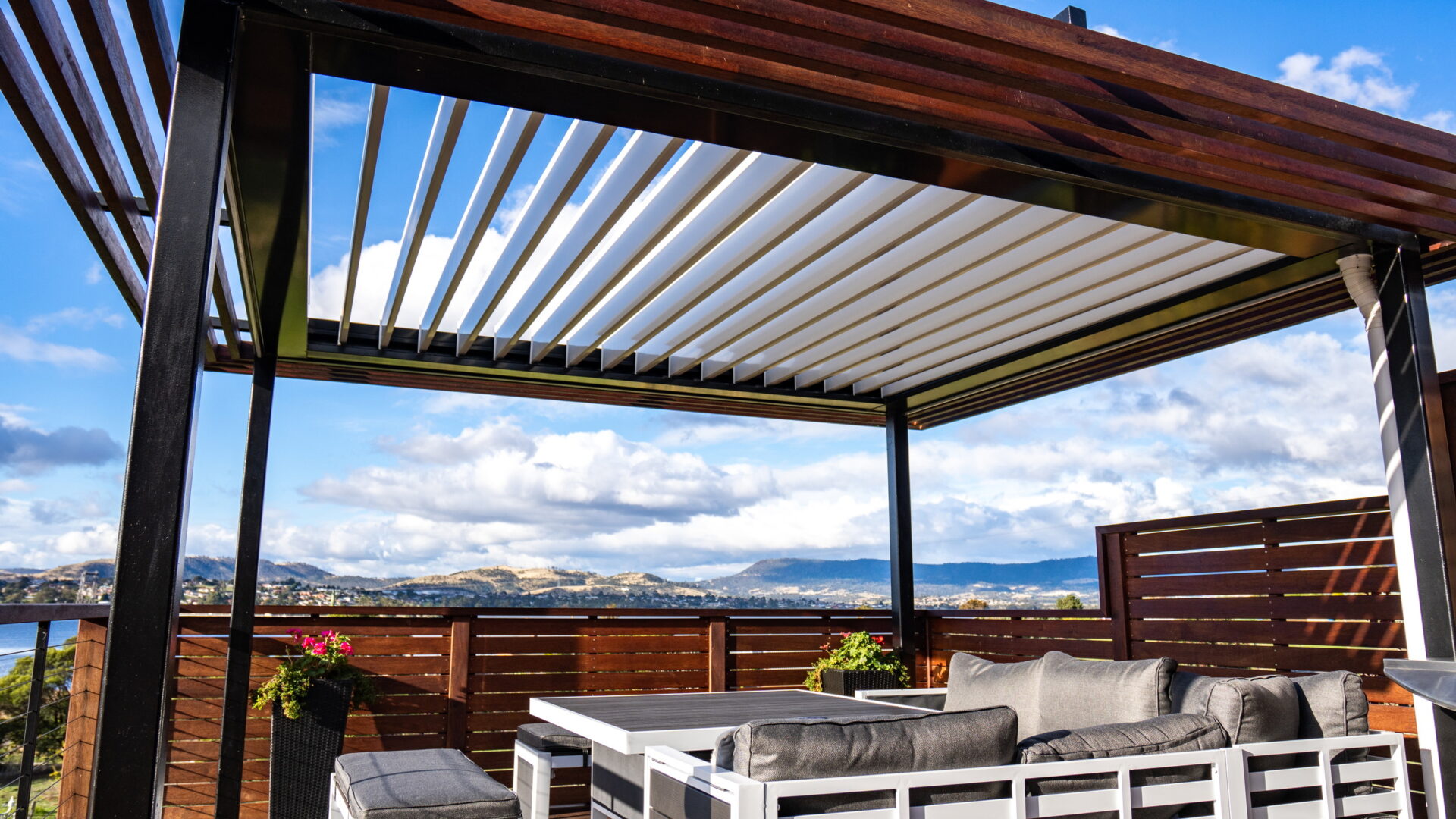 We supplied and installed one of our motorised opening roof systems for this cosy outdoor space in Granton with a picturesque view. The blades were finished with Dulux Surfmist Satin, contrasting the darker colours of the timber and steel frame.